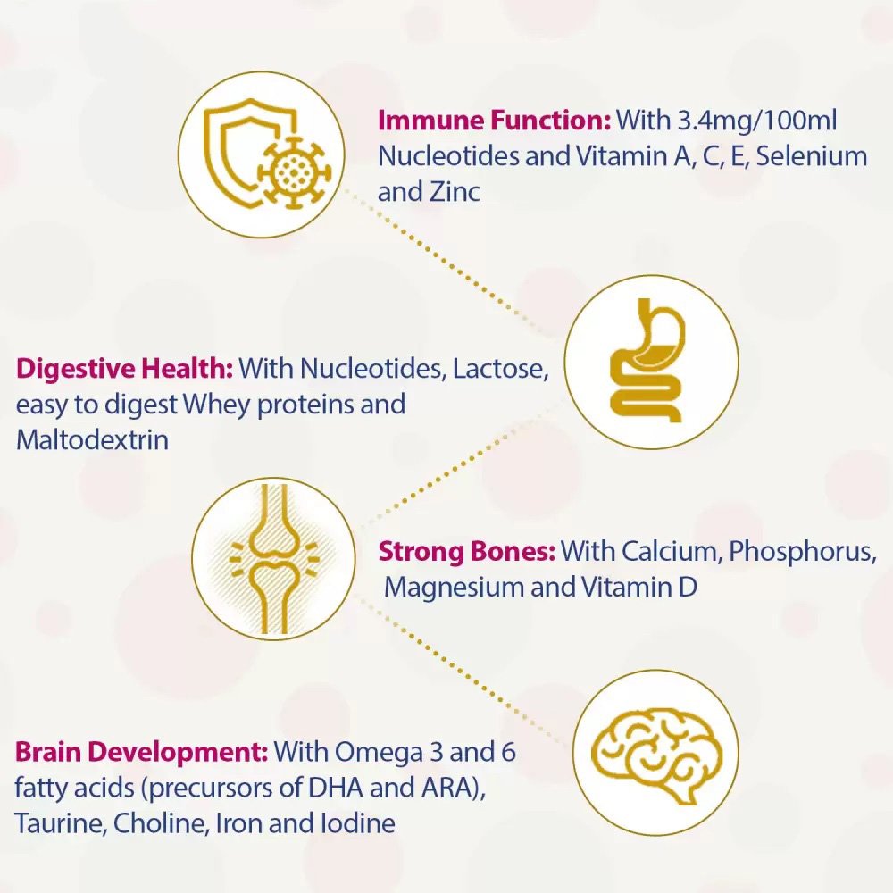 Delivers the right nutrients to support overall growth and development of babies. Contains easy to digest whey proteins & 100% lactose, nucleotides to support immunity and help develop strong bones.